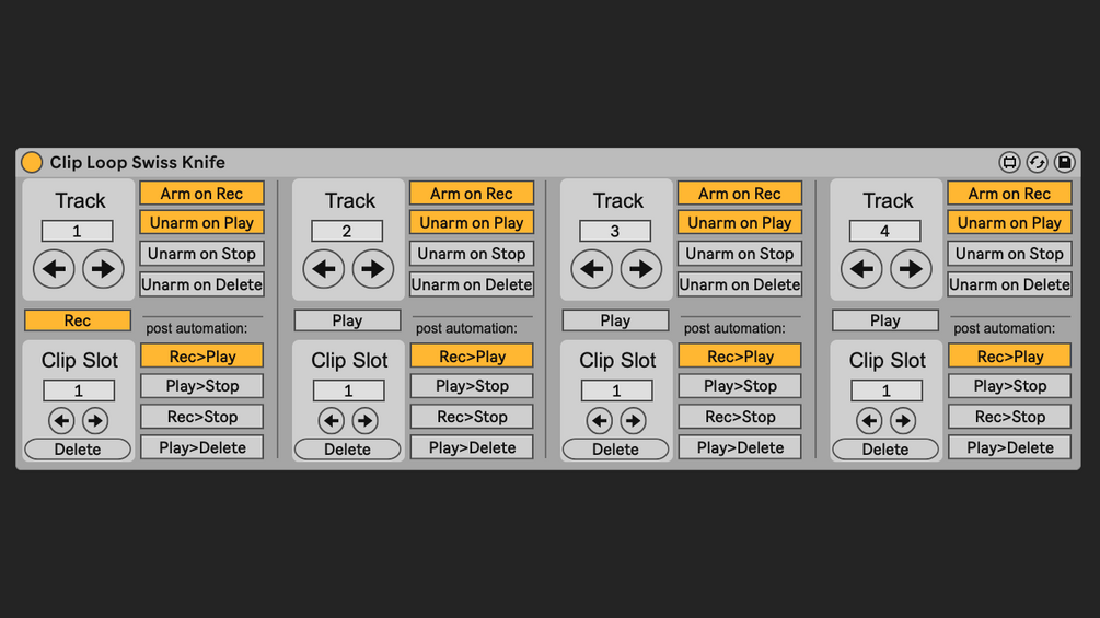 When arranging a live looping performance you usually run into a few problems. You need a method to trigger clips exactly when you need them, e.g. with virtual midi (IAC driver on Mac) mapped to the clip slots. The downside of this method is that the mapping can become tedious pretty quickly and you need to send a midi message for track arm, clip launch, clip stop etc. separately. This leads to distraction from the actual arrangement and a loss of overview. The Clip Loop Swiss Knife tries to solve this problem by letting you automate the two values of the device's launch toggle according to the selected (Post-)Automation Mode.